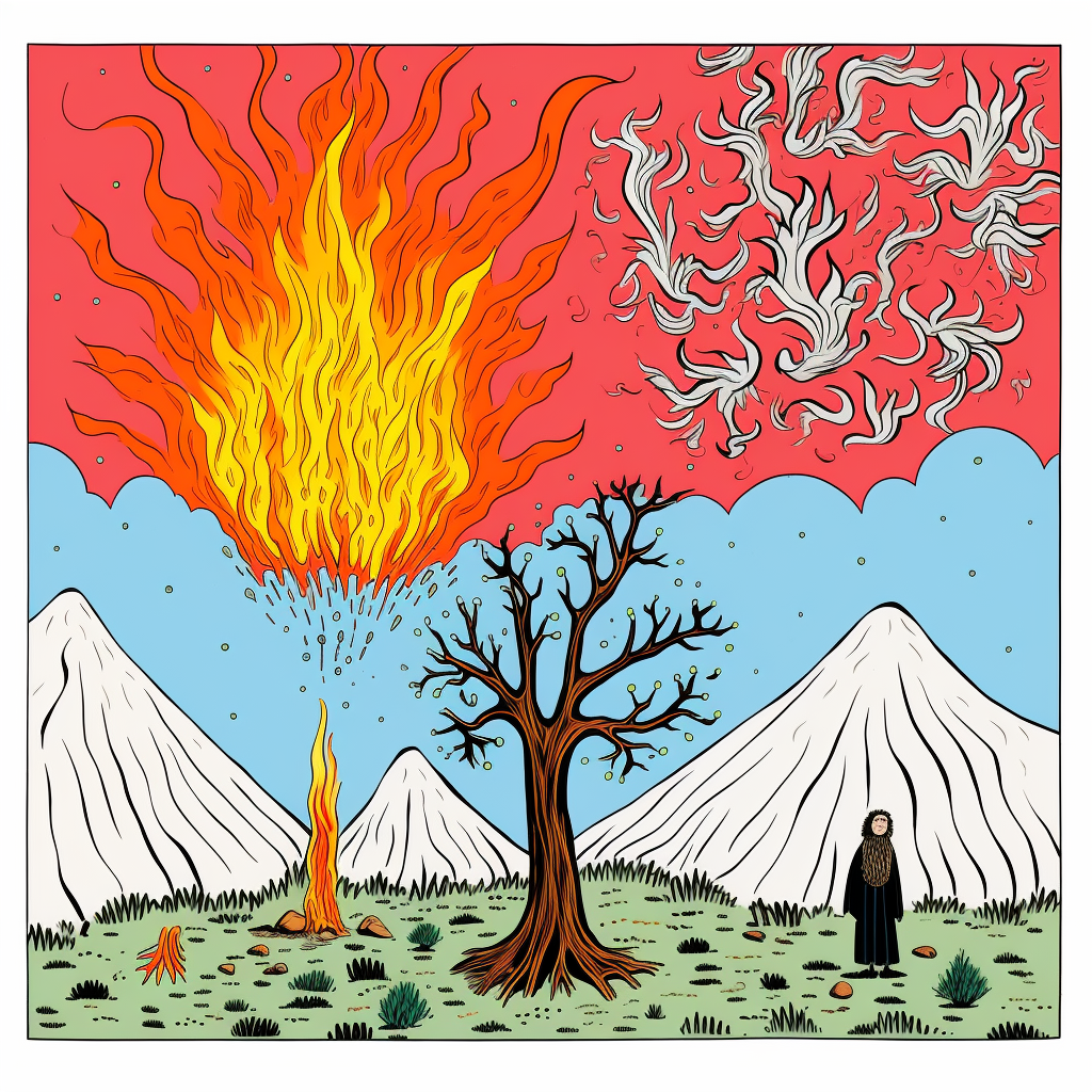 Bible Story, Burning Bush and Moses, very detailed, by Allie Brosh, illustration,