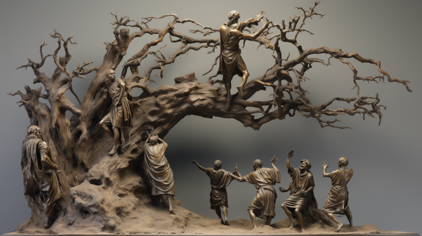 A narrative scene from 2 Samuel 21:1-9, focusing on the moment of sacrifice where Saul's sons are hanged, a desolate hill with a single dead tree from which the bodies hang, the atmosphere heavy with the solemnity and remorse of the act, Sculpture, using weathered bronze with detailed texture work, --ar 16:9