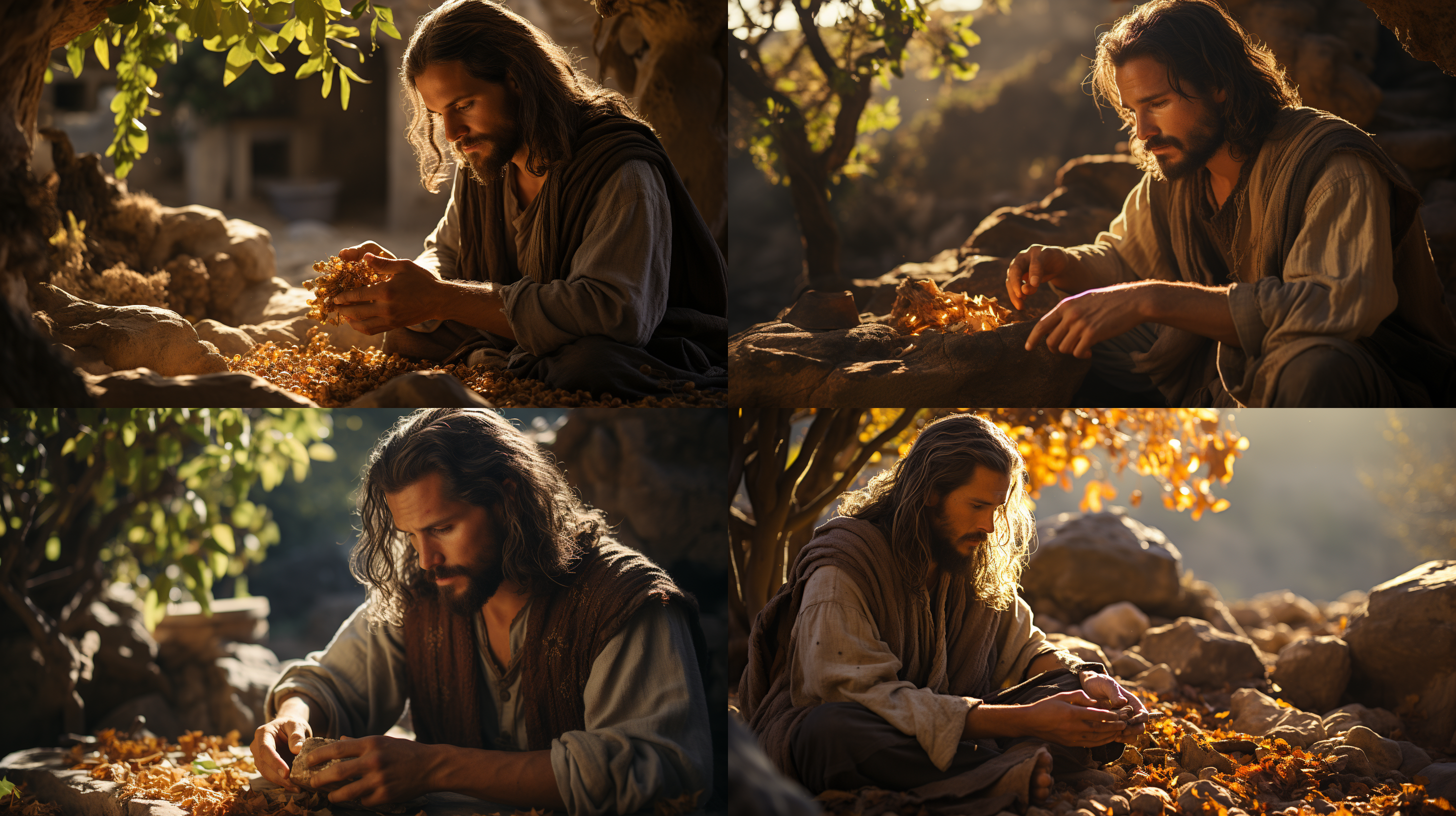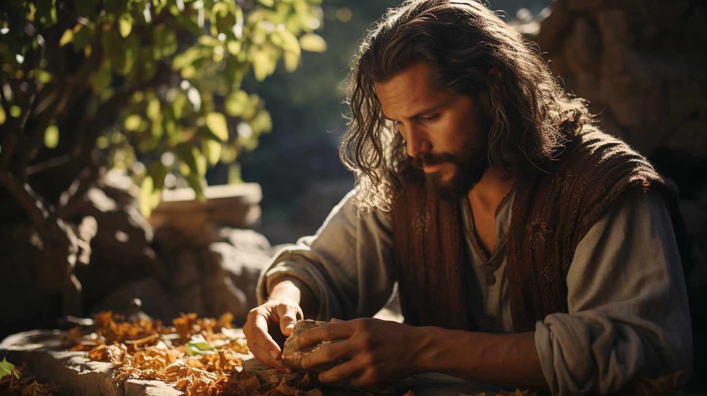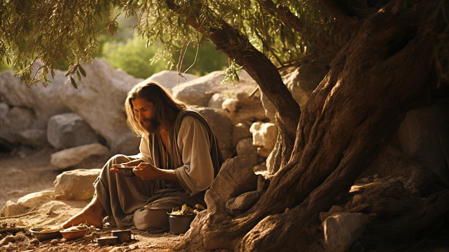 Prophet Elijah sitting under a broom tree, eating a loaf of bread baked on hot stones and a jar of water, tired yet spiritually determined. The broom tree's leaves filter the harsh sunlight, casting dappled light on Elijah’s face. The jar and the loaf look modest but serve as divine sustenance, hinting at his prophetic journey ahead, Photo taken by Jane Doe with a Canon EOS 5D Mark IV and a 50mm lens, Award Winning Photography style, Studio lighting combined with natural sunlight, 8K, Ultra-HD, Super-Resolution. --ar 16:9
