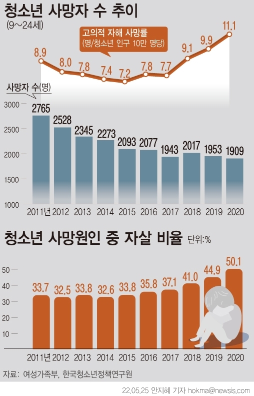 극단 선택은 2011년부터 10년째 청소년 사망 원인 1위다. 사망자 수는 해당 기간 2765명에서 1909명으로 감소했으나 자살 비율은 33.7%에서 50.1%로 크게 늘었다.