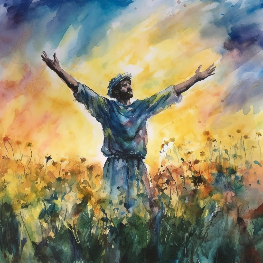 /imagine prompt: Watercolor, inspired by Claude Monet. King David in a field, arms raised to the sky, colors blending into the background. Cool color temperature, face relaxed and content. Diffused lighting, dreamy atmosphere. --v 5 --stylize 1000